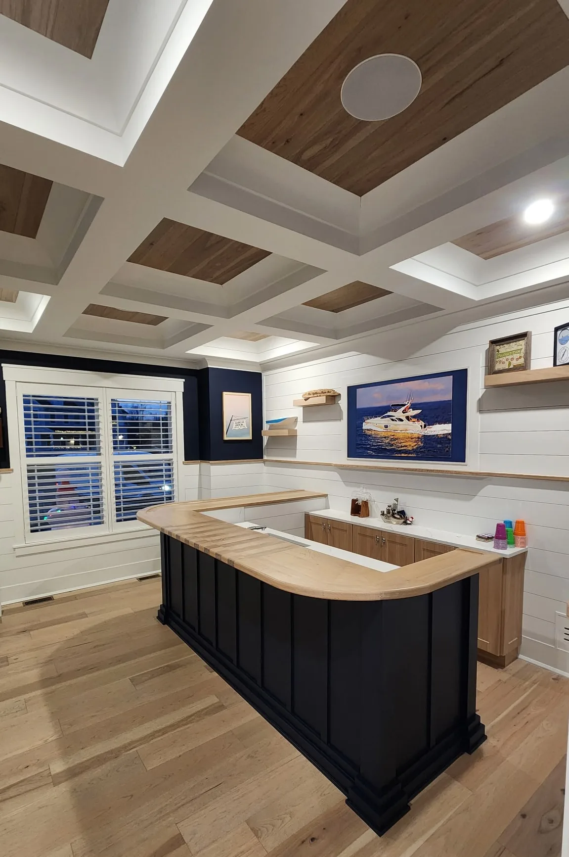 Our built ins have lighting that can be changed from cool to warm and dimmed based on what you want. We’ve never seen anything like it- it really makes the room feel so much more luxurious and gives the room a “wow” factor that continues to blow us, and our guests, away. Our dry bar had custom tiles we purchased on our honeymoon that Chris’s team cut into the tile backsplash, making it lay flat and makes the entire bar area so much more personal and special. The communication was top notch.
