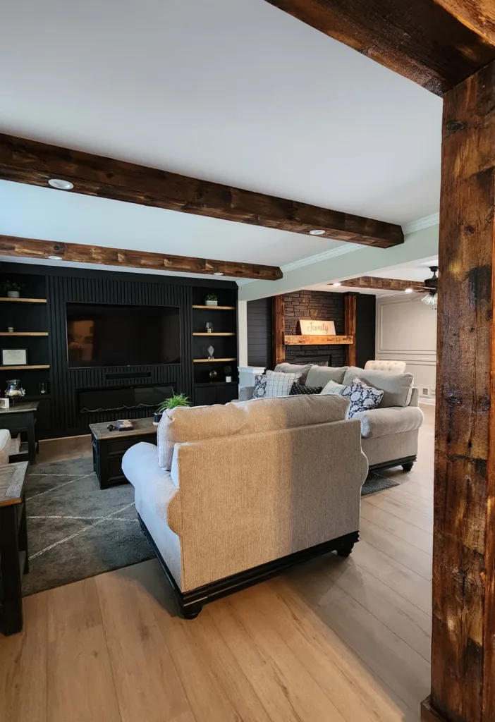 Our work blends structure and style. Beams add warmth and depth. Built-ins create storage that feels architectural, not added on. Accent walls and stone features become focal points without overpowering the space. Trim, transitions, and spacing are handled with the same level of care as the main features.